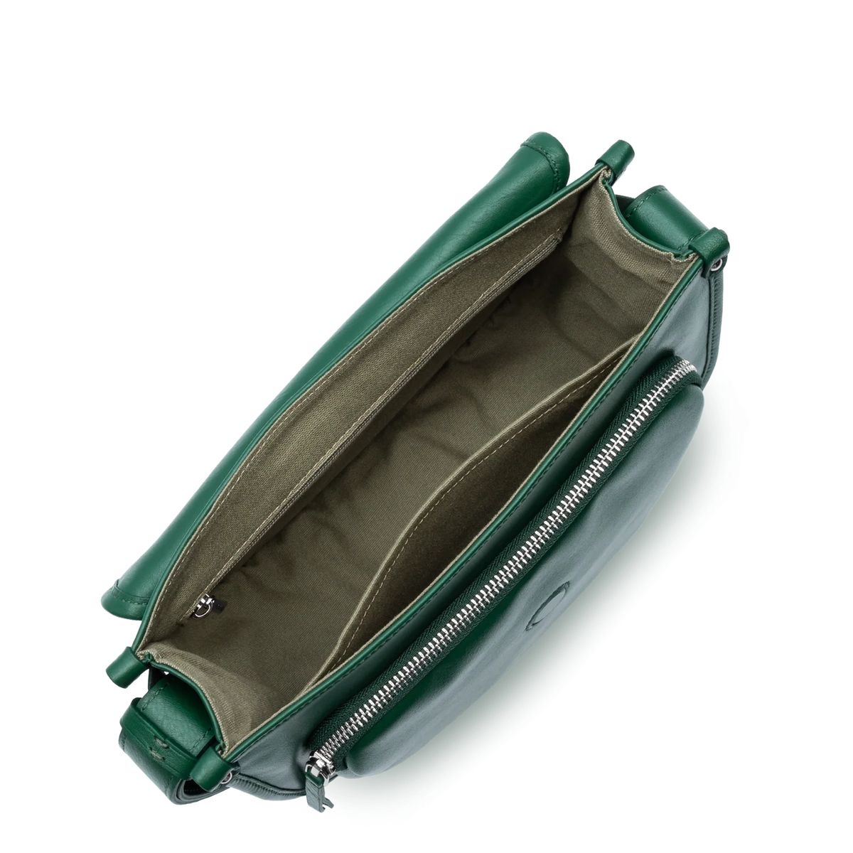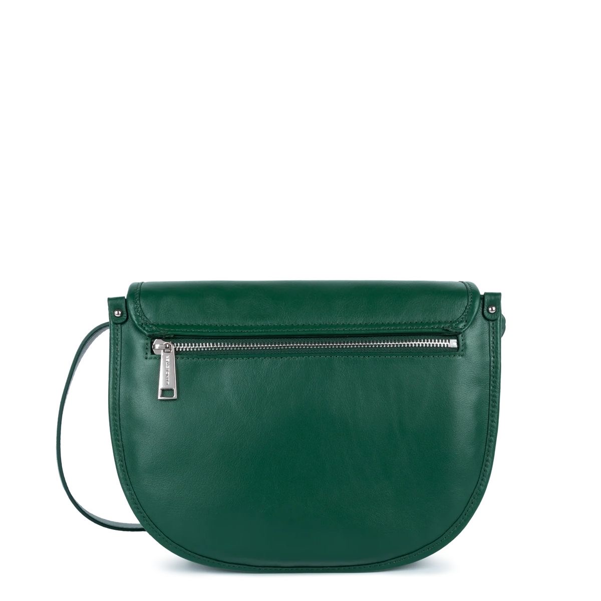 This messenger bag is crafted from full-grain cowhide leather. It closes with a magnetic flap. It features a rear exterior zippered pocket, a front zippered pocket, a simple interior pocket, and a zippered interior pocket. It can be worn over the shoulder or crossbody.