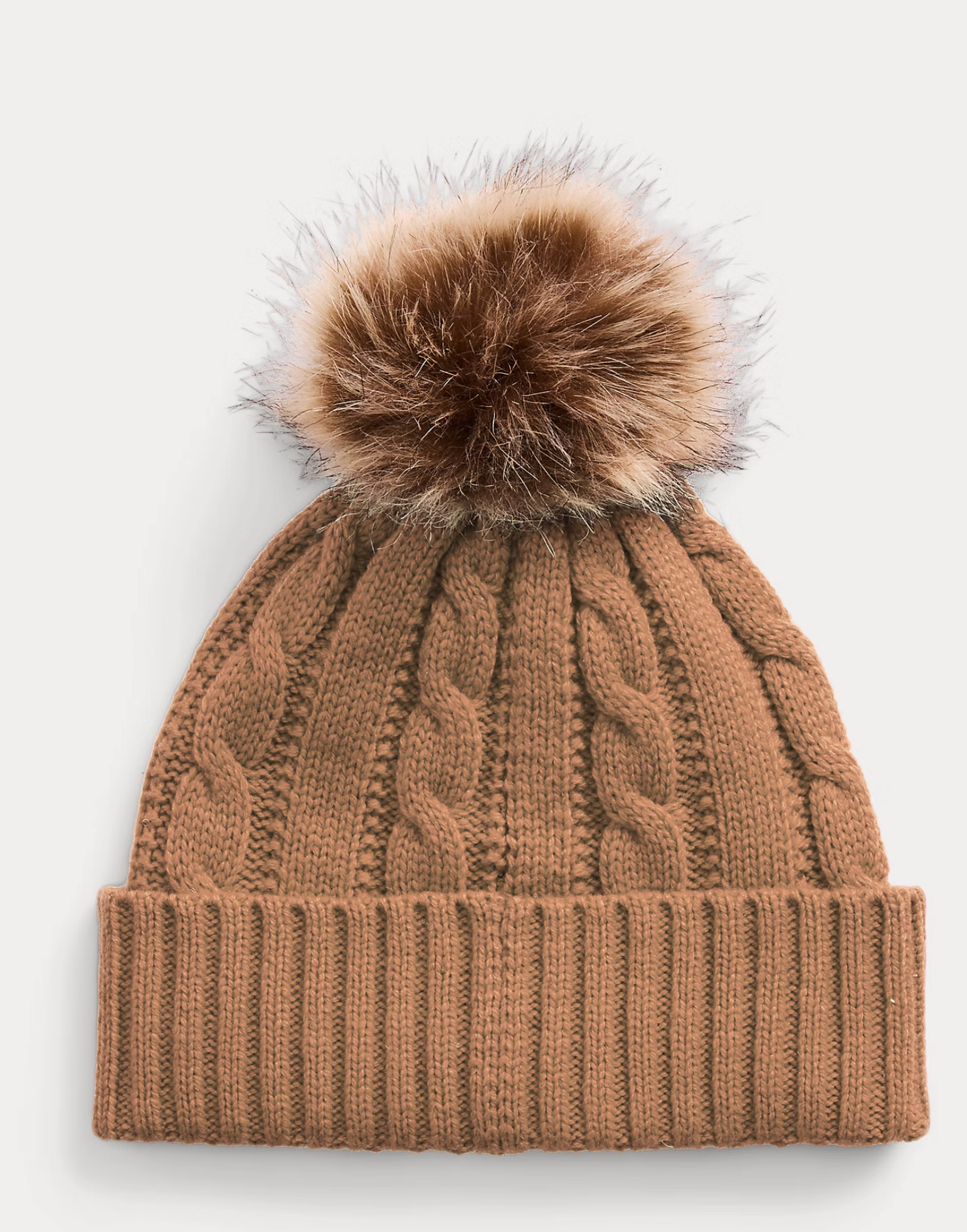 LAUREN RALPH LAUREN CREST PATCH POM POM CABLE KNIT BEANIE