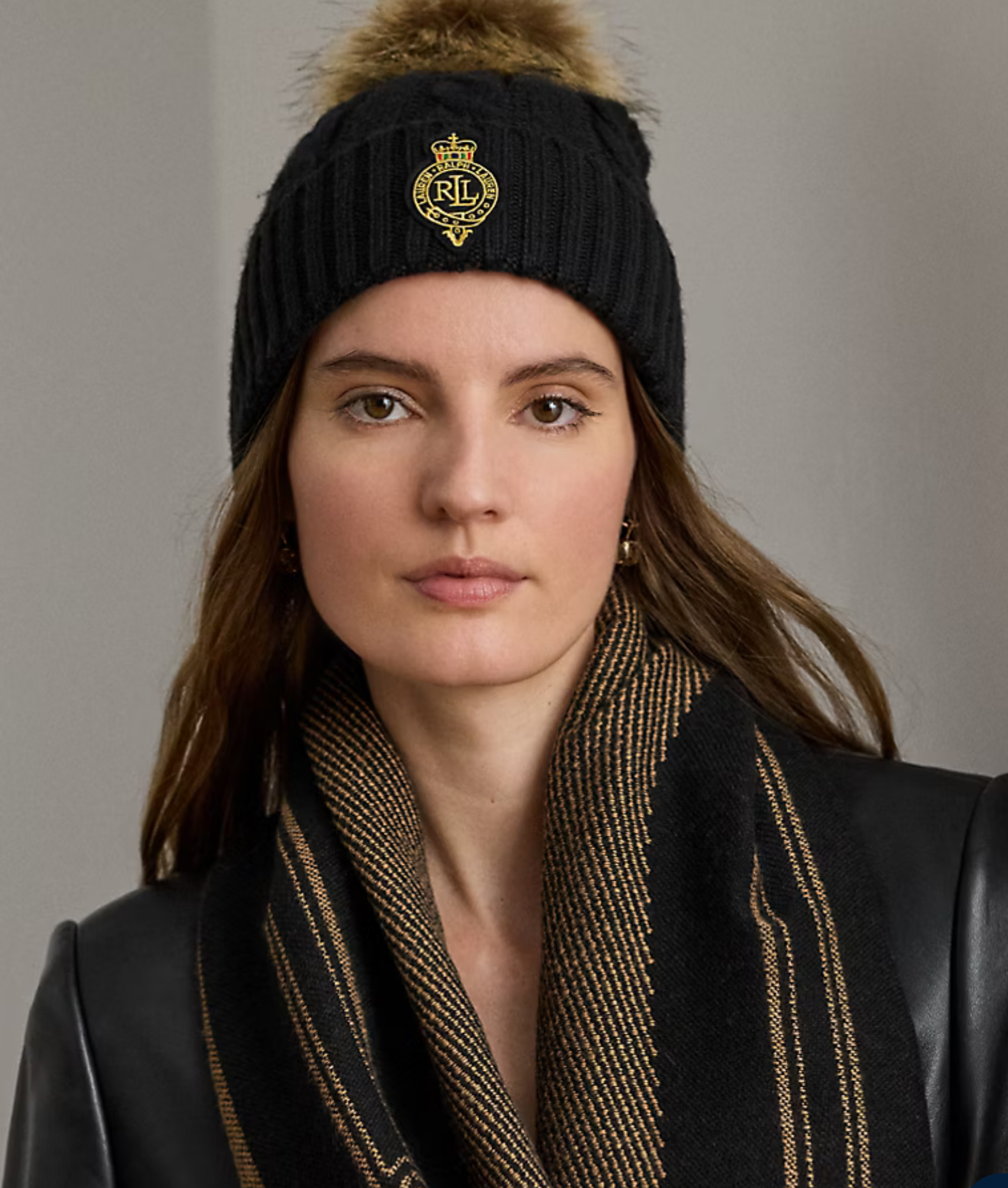 LAUREN RALPH LAUREN CREST PATCH POM POM CABLE KNIT BEANIE