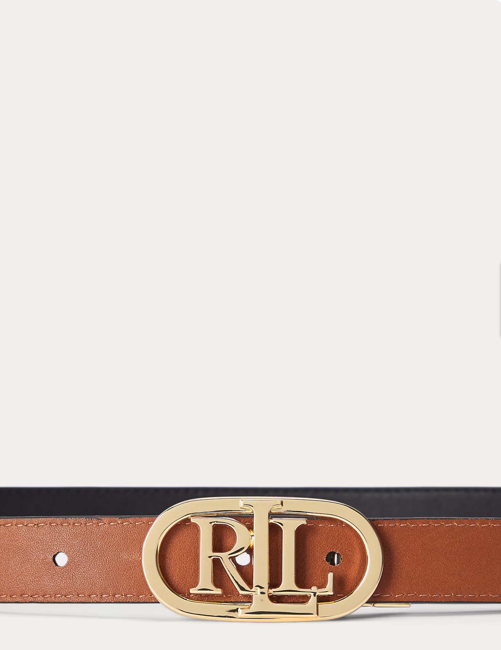 - Polished single-prong “LRL” oval-shaped metal buckle.
