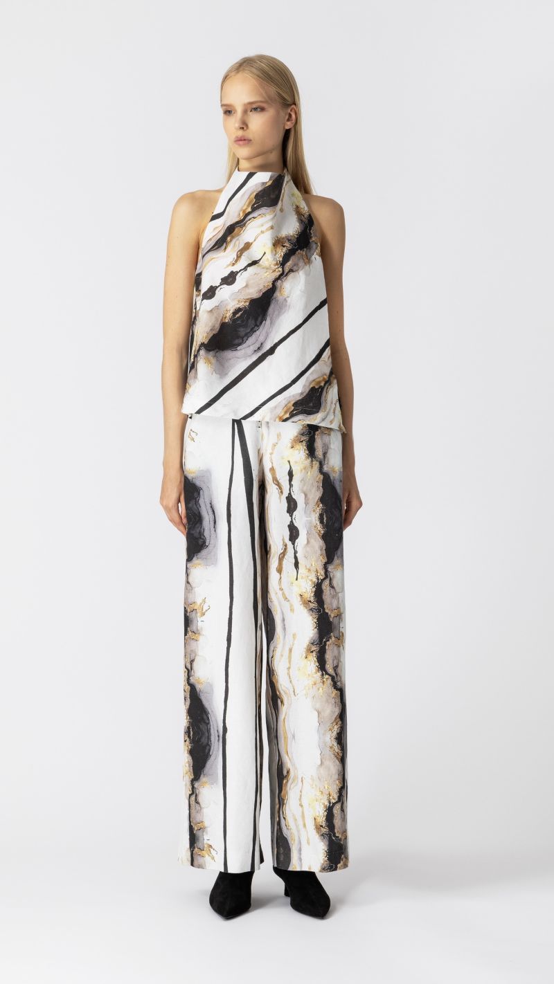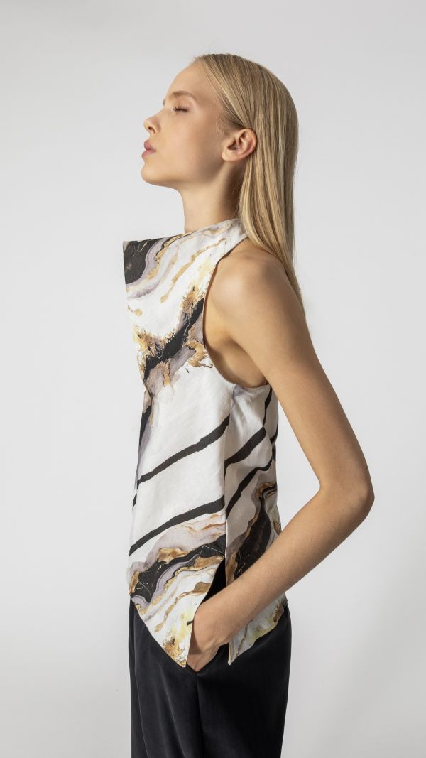 Είναι διακοσμημένο με εντυπωσιακό marble print σε τόνους μπεζ, μαύρο, γκρι και χρυσούς.