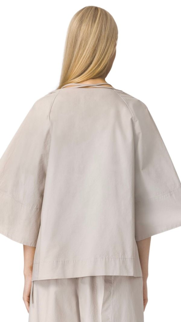 Κομψή μπλούζα (top) από την ομώνυμη συλλογή, κατασκευασμένη από 100% βαμβάκι. Χαρακτηρίζεται από φαρδιά, άνετη γραμμή (loose fit), 3/4 ασύμμετρα μανίκια και διακοσμητικό δέσιμο στη λαιμόκοψη. Είναι διαθέσιμη σε μπεζ/ουδέτερους τόνους, προσφέροντας μια άνετη και στιλάτη