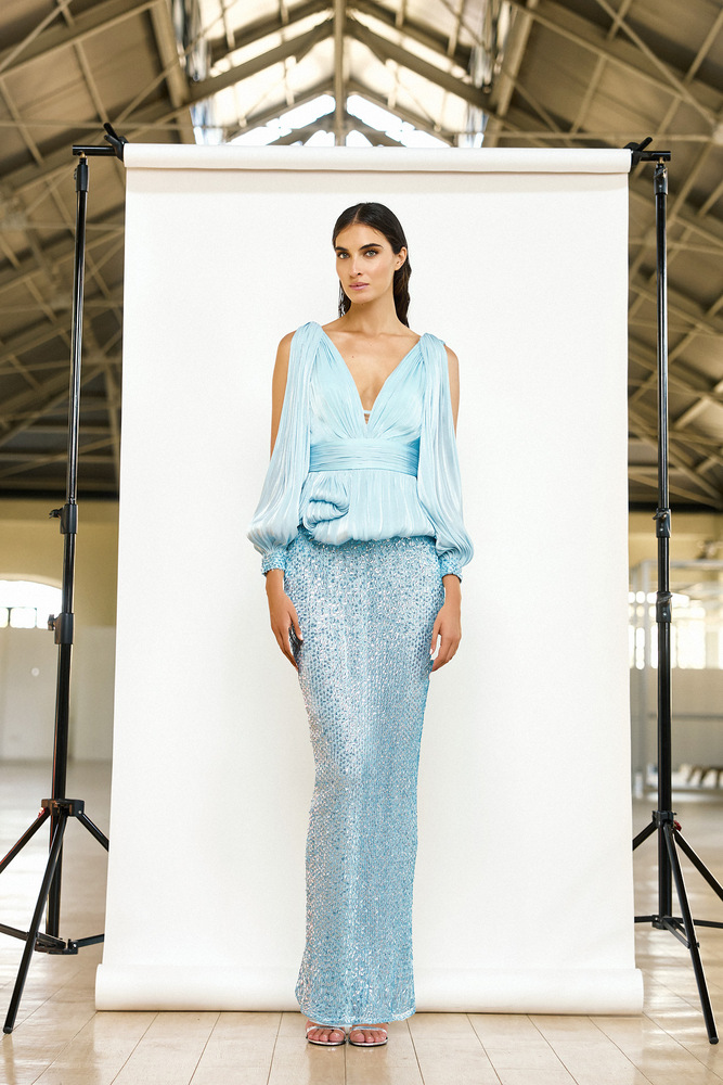 Αναδείξτε τη θηλυκότητά σας με αυτό το εντυπωσιακό σετ σε παγωμένο γαλάζιο χρώμα. Το επάνω μέρος, με αέρινη υφή και διακριτικό ντραπέ σχέδιο, αγκαλιάζει κομψά το σώμα, ενώ τα ελαφρώς διάφανα μανίκια προσθέτουν μία ρομαντική και αιθέρια αίσθηση.Η εφαρμοστή φούστα, διακοσμημένη με λαμπερές παγιέτες, χαρίζει μοναδική λάμψη σε κάθε σας εμφάνιση, δημιουργώντας ένα εκθαμβωτικό αποτέλεσμα σε κάθε σας βήμα.Ιδανική επιλογή για βραδινές εξόδους, επίσημες εκδηλώσεις ή ιδιαίτερες περιστάσεις, αυτό το φόρεμα συνδυάζει κομψότητα, φινέτσα και διακριτική πολυτέλεια.