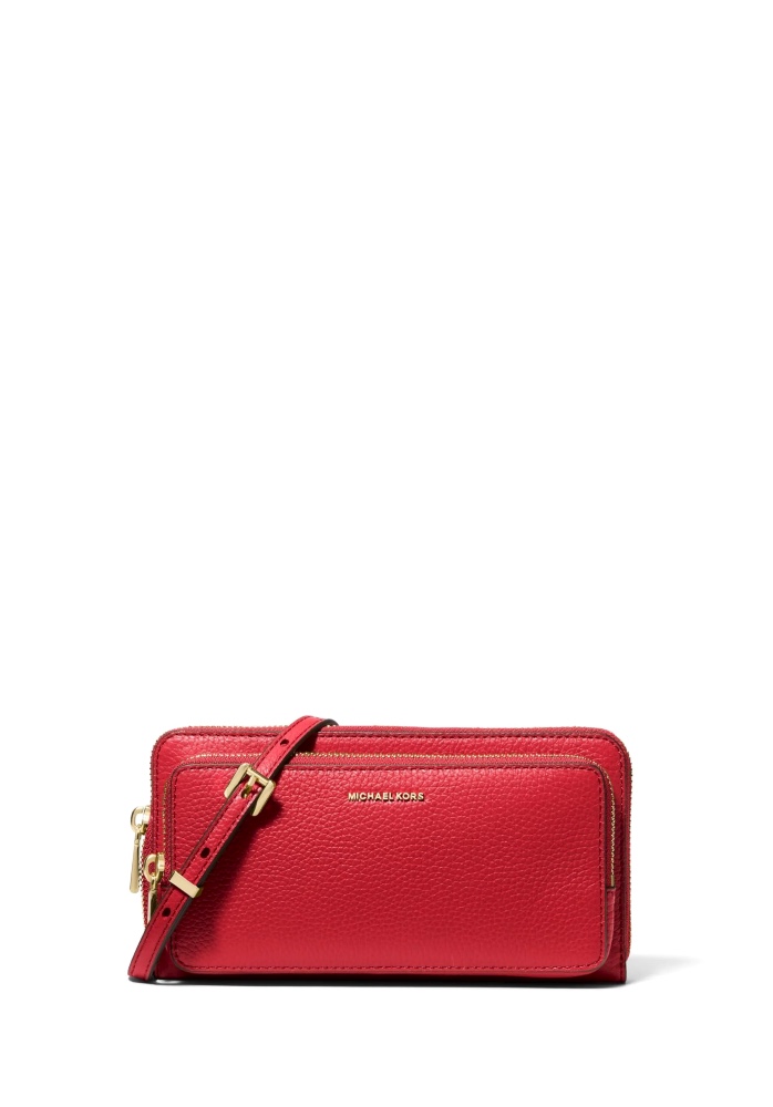 Streamlined yet spacious, our Jet Set continental crossbody bag is crafted from pebbled leather with gold-tone hardware for sophisticated appeal. This large-sized style features a sleek rectangular silhouette with organized compartments to keep your essentials secure and a removable adjustable strap for versatile carrying options. Wear it crossbody for hands-free convenience or carry it as a clutch for polished evening style.