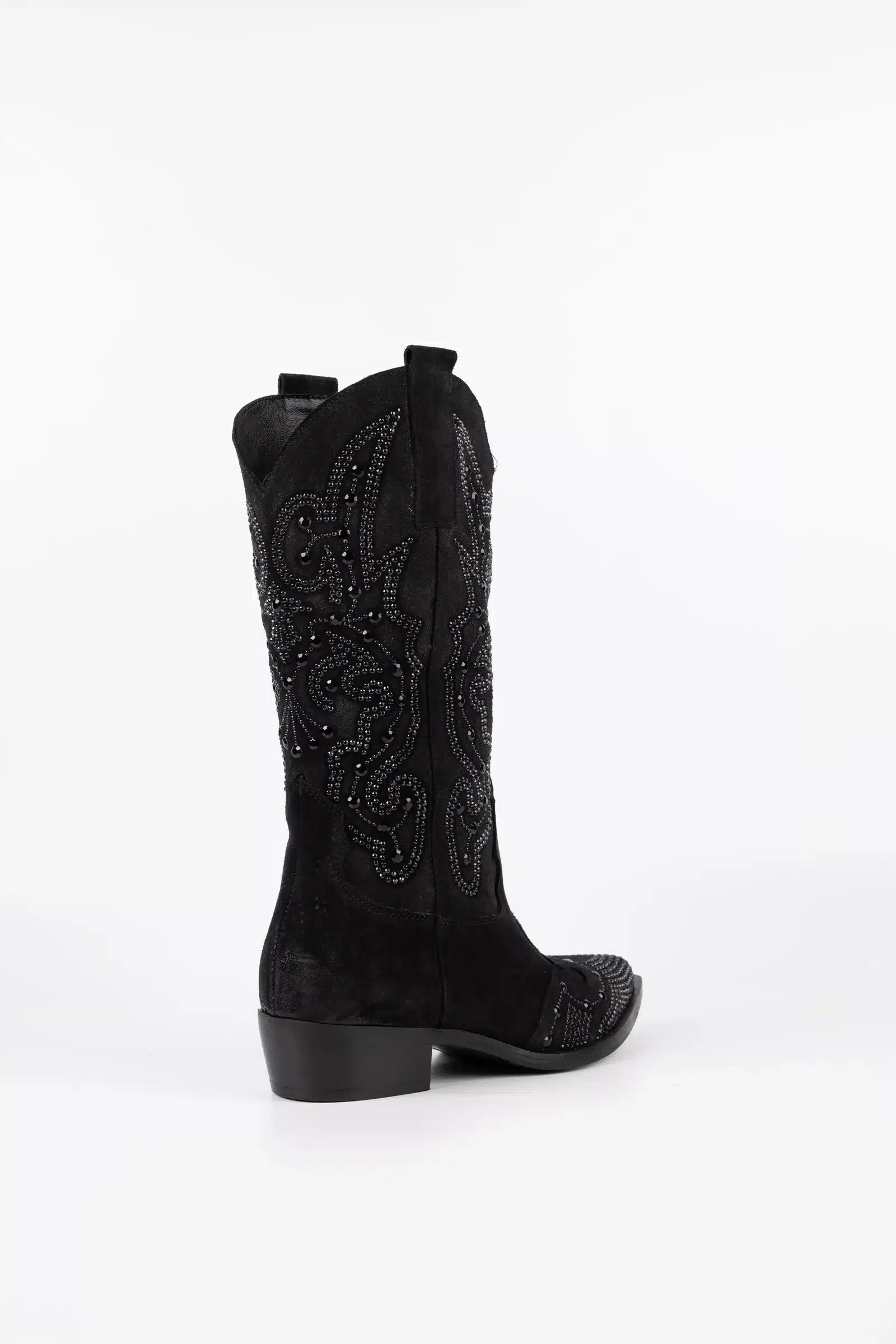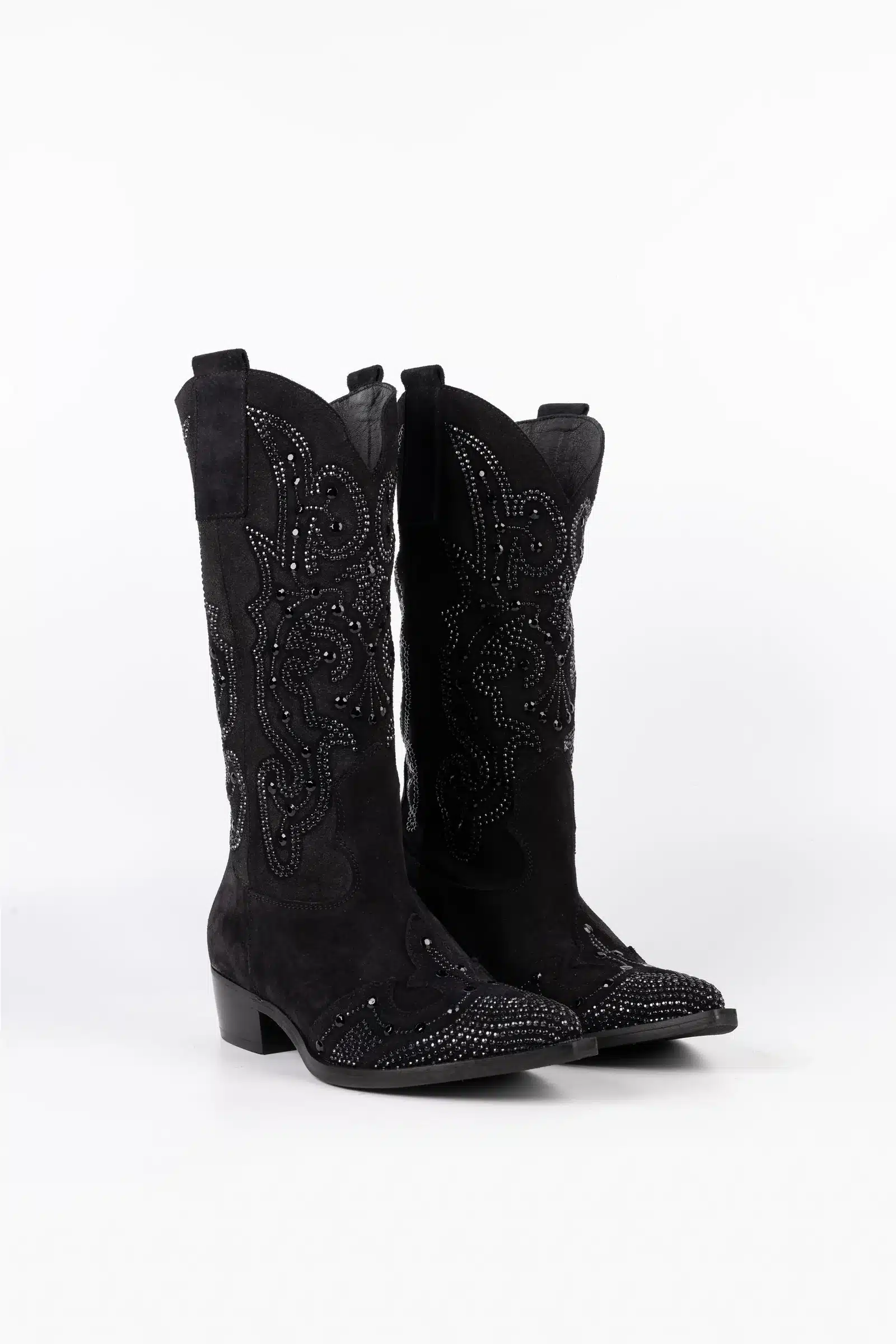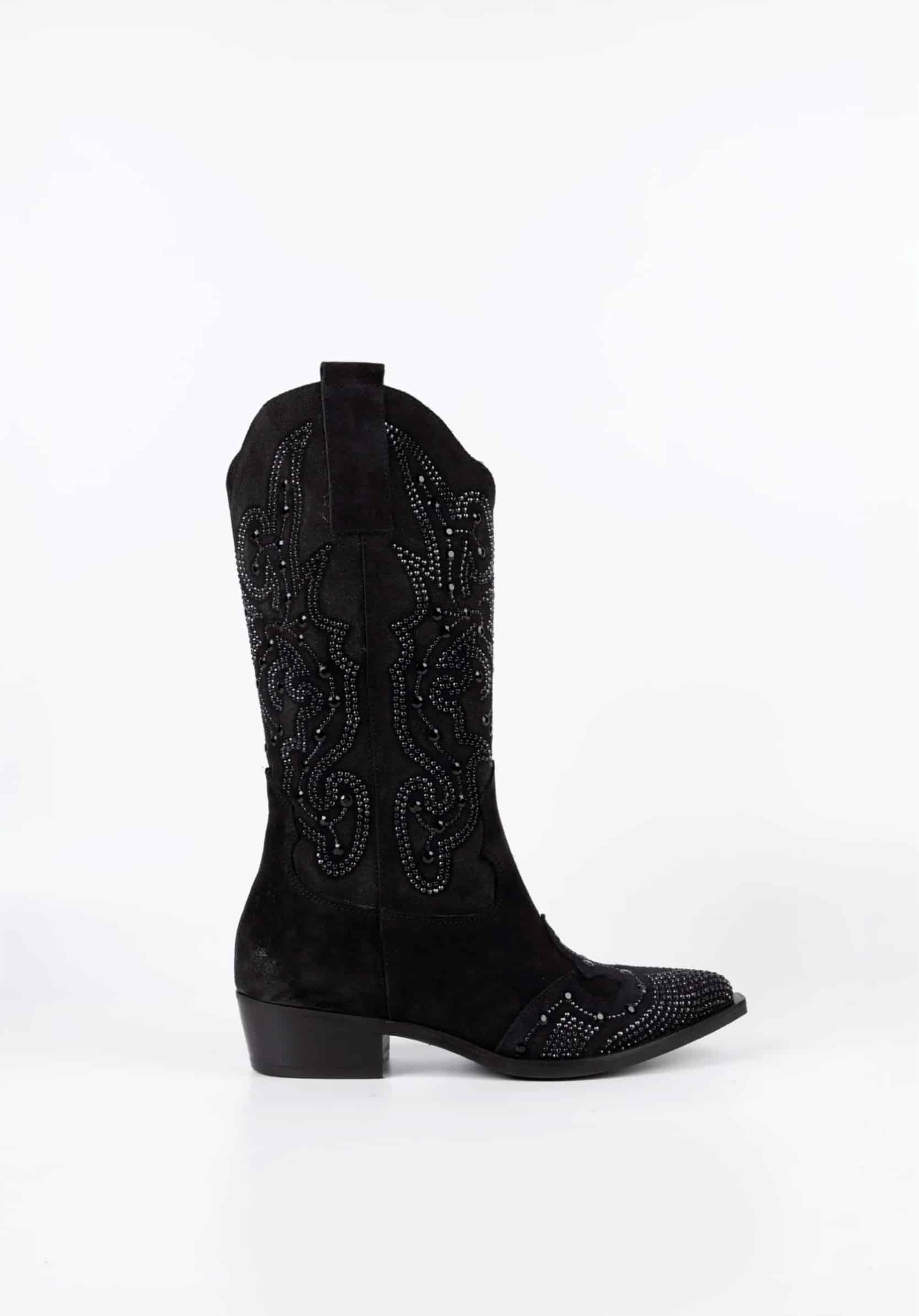 Οι καουμπόικες μπότες Sophie είναι ένας τέλειος συνδυασμός κομψότητας και έντονο στυλ. Κατασκευασμένα από μαλακό σουέτ, χαρακτηρίζονται από την παρουσία αστραφτερών στρας που διακοσμούν έξοχα τόσο το πάνω μέρος όσο και το δάχτυλο του ποδιού. Το περίτεχνο κέντημα συνδυάζεται με τα στρας, δημιουργώντας ένα εκλεπτυσμένο και λαμπερό σχέδιο. Η επένδυση από δέρμα αρνιού εξασφαλίζει άνετη και περιβάλλουσα εφαρμογή.