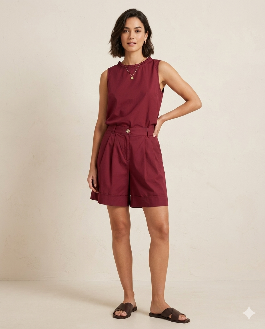 Ανανεώστε την καλοκαιρινή σας γκαρνταρόμπα με αυτό το κομψό σορτς από τη συλλογή MY T Wearables. Σε μια εντυπωσιακή burgundy/bordeaux απόχρωση, αυτό το κομμάτι συνδυάζει την άνεση με το σοφιστικέ στυλ. Διαθέτει ψηλόμεση γραμμή με διακριτικές πιέτες στο μπροστινό μέρος που κολακεύουν τη σιλουέτα, ενώ το λαστιχο στη μέση στο πίσω μέρος εξασφαλίζει τέλεια εφαρμογή όλη μέρα. Κατασκευασμένο από ελαφρύ, δροσερό ύφασμα, είναι η ιδανική επιλογή για casual chic εμφανίσεις από το πρωί έως το βράδυ.