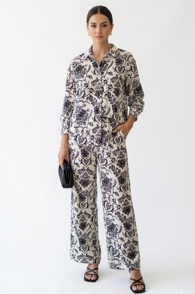 Μοτίβο: Το σύνολο διαθέτει ένα εντυπωσιακό vintage floral ή damask print σε σκούρο μπλε ή μαύρο χρώμα πάνω σε εκρού/λευκή βάση, που θυμίζει περίτεχνα σχέδια πορσελάνης ή κεντήματος.