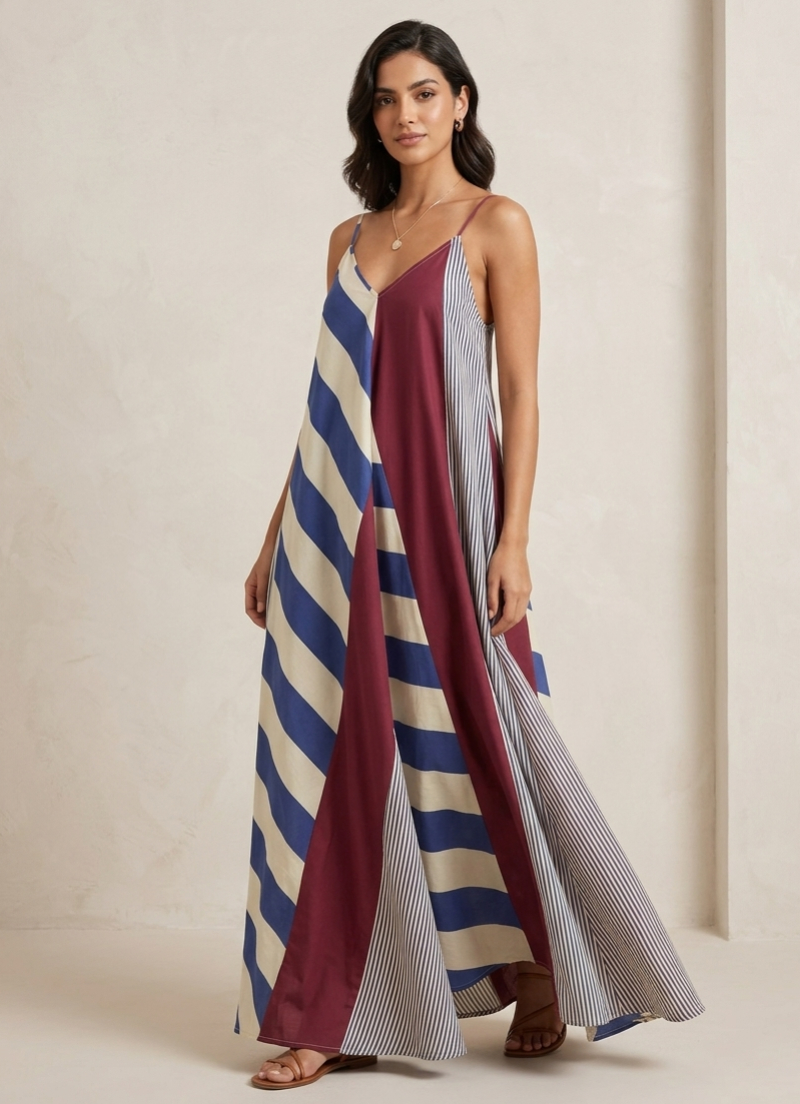 V-NECK STRIPED PANEL CAMISOLE DRESS