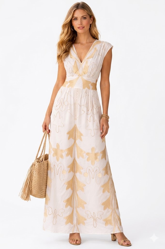 GOLDEN EMBROIDERY V – NECK MAXI DRESS IN WHITE