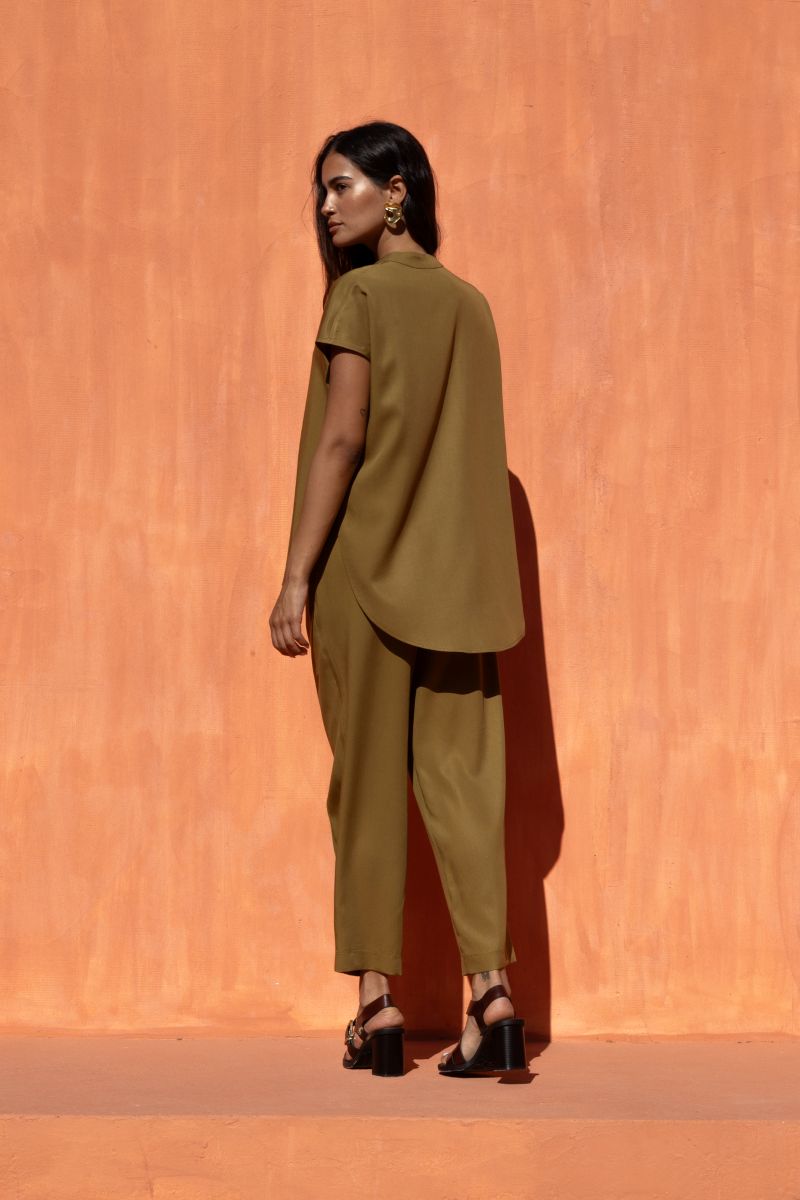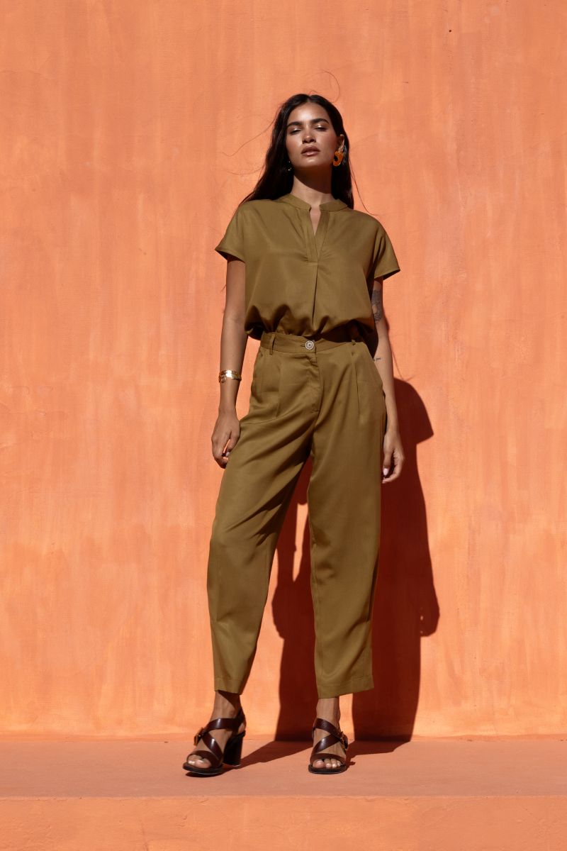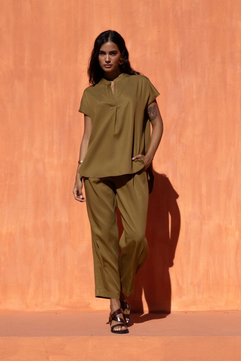 Ένα αέρινο κοντομάνικο πουκάμισο σε άνετη γραμμή, κατασκευασμένο από φυσικά υλικά που αναπνέουν. Ο μάο γιακάς και η διακριτική V λαιμόκοψη χαρίζουν μια σοφιστικέ λεπτομέρεια, καθιστώντας το ιδανικό τόσο για casual εμφανίσεις όσο και για πιο επίσημα καλοκαιρινά looks.