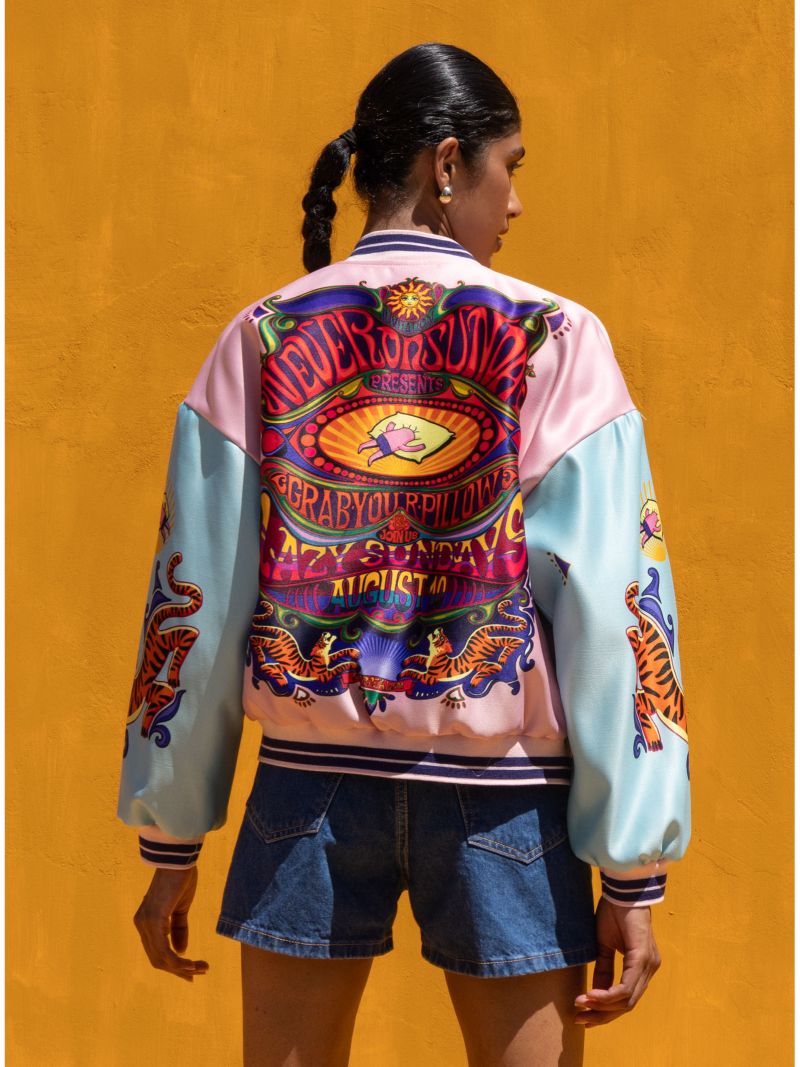 Εντυπωσιακό jacket με σατέν υφή και statement graphic print στο μπροστινό μέρος που δίνει έντονο χαρακτήρα στο σύνολο. Η ροζ βάση συνδυάζεται με παστέλ αποχρώσεις στα μανίκια και rib τελείωμα στον γιακά και στη μέση, δημιουργώντας ένα ιδιαίτερο retro-pop αποτέλεσμα. Η χαλαρή γραμμή και το ελαφρύ ύφασμα προσφέρουν άνεση και μοντέρνο street style, ιδανικό για ξεχωριστές καθημερινές εμφανίσεις.