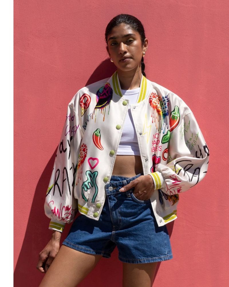 Εντυπωσιακό jacket με σατέν υφή και πολύχρωμο urban graphic μοτίβο που δίνει έντονο χαρακτήρα στο σύνολο. Τα ζωηρά prints με graffiti στοιχεία και pop χρώματα δημιουργούν δυνατή αντίθεση πάνω στο ecru φόντο, ενώ η χαλαρή γραμμή και το rib τελείωμα στον γιακά και στα μανίκια προσφέρουν άνεση και σύγχρονο street style. Ένα statement κομμάτι που ξεχωρίζει σε κάθε casual εμφάνιση.