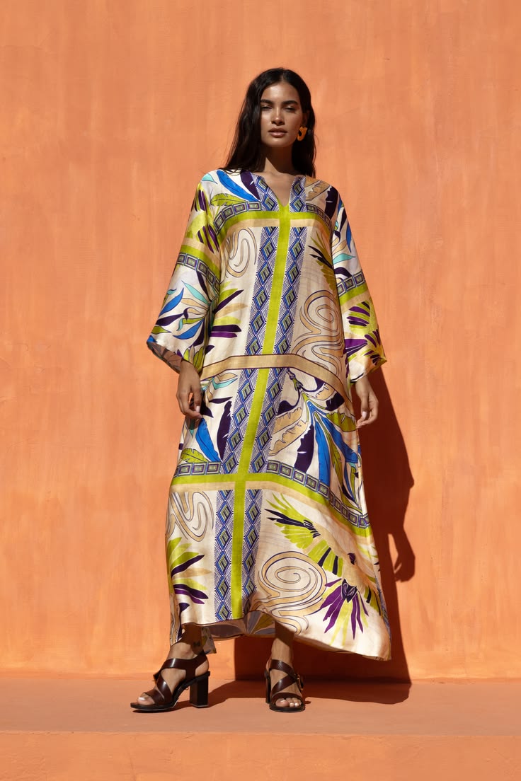 Maxi φόρεμα με εντυπωσιακό tropical print σε αποχρώσεις μπλε, lime, μωβ και εκρού που αποπνέει resort αισθητική. Η ρευστή, αέρινη γραμμή και το χυτό ύφασμα δημιουργούν κομψή κίνηση, ενώ τα φαρδιά μανίκια προσθέτουν χαλαρή πολυτέλεια στο σύνολο.