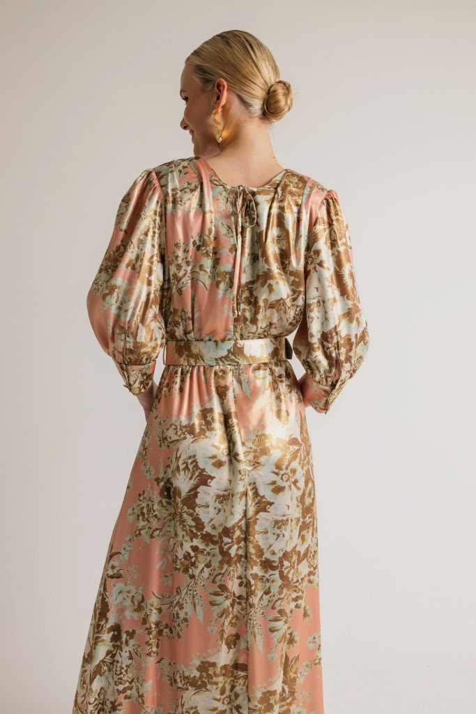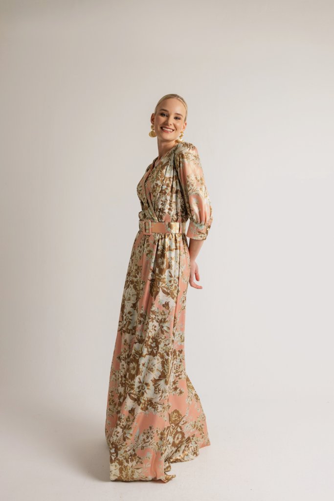 Φόρεμα κρουαζέ με μανίκι και ζώνη εμπριμέ ροζ