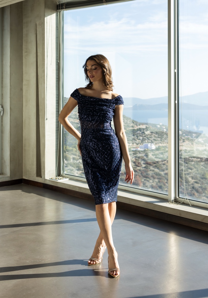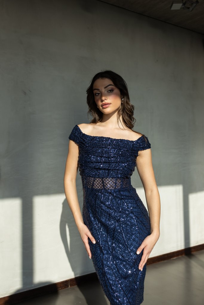 OPEN FASHION SEQUIN MIDI OFF SHOULDER DRESS