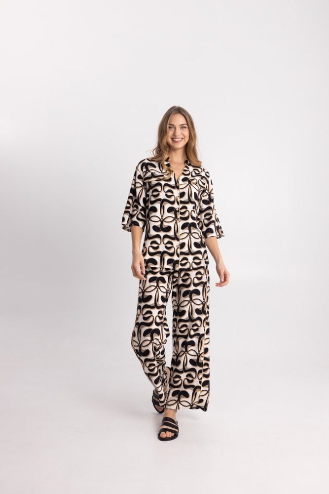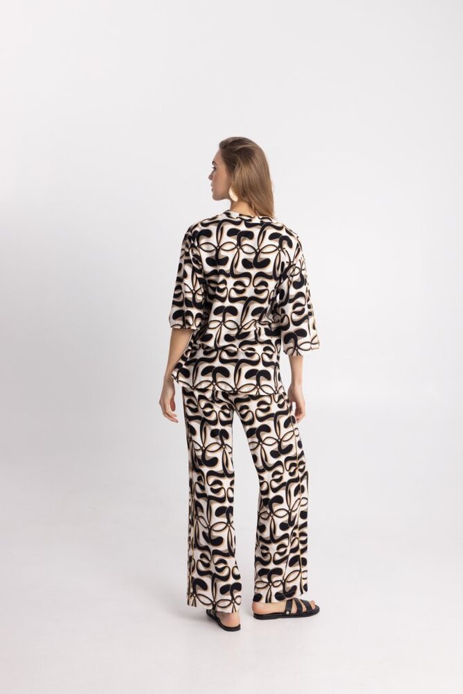 - Open Fashion κομψό και απόλυτα σύγχρονο, αυτό το γυναικείο καλοκαιρινό σετ σε μααύρο και εκρού αποχρώσεις ξεχωρίζει για τα ιδιαίτερα abstract σχέδιά του που δημιουργούν ένα δυναμικό και κομψό αποτέλεσμα. Το πουκάμισο με γιακά και κουμπιά στο μπροστινό μέρος χαρίζει διαχρονικό χαρακτήρα, ενώ η άνετη γραμμή του συνδυάζεται αρμονικά με το παντελόνι σε ίσια, φαρδιά γραμμή. Το σετ αγκαλιάζει το σώμα χωρίς να το περιορίζει, προσφέροντας άνεση, στυλ και ευελιξία για πολλές διαφορετικές περιστάσεις.