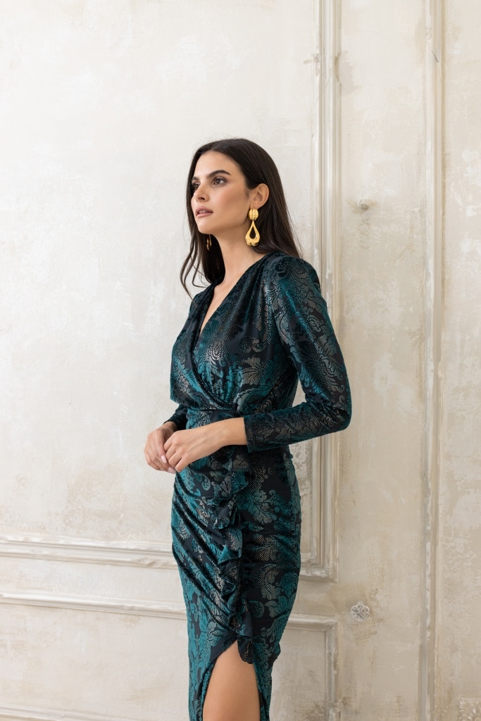 Βελούδινο φόρεμα , κρουζέ στο μπούστο με βολάν και σκίσιμο στο πλάι, σε κυπαρισσί αποχρώσεις.