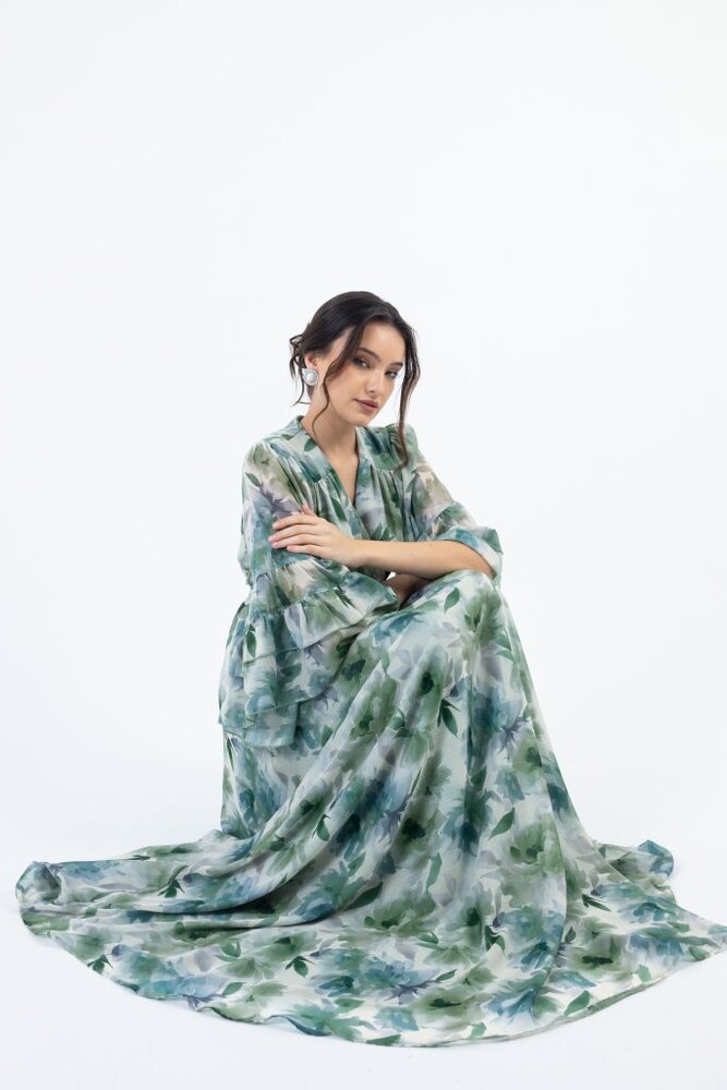 Αέρινο και ιδιαίτερα κομψό, αυτό το maxi φόρεμα σε πράσινες και σιελ αποχρώσεις με υδατογραφικό φλοράλ σχέδιο αποπνέει ρομαντισμό και φυσική φρεσκάδα. Η απαλή βάση συνδυάζεται αρμονικά με τις διαβαθμίσεις του πράσινου, δημιουργώντας ένα αποτέλεσμα που θυμίζει καλοκαιρινό τοπίο.Η κρουαζέ γραμμή στο επάνω μέρος αγκαλιάζει όμορφα το σώμα και αναδεικνύει διακριτικά το ντεκολτέ, ενώ δένει στο πλάι, προσφέροντας προσαρμοσμένη εφαρμογή στη μέση. Τα μακριά μανίκια είναι ημιδιάφανα και καταλήγουν σε διαδοχικά βολάν, χαρίζοντας κίνηση και αέρινη αίσθηση σε κάθε βήμα.Η maxi γραμμή πέφτει ανάλαφρα μέχρι κάτω, δημιουργώντας ροή και κομψότητα στο περπάτημα. Το συνολικό αποτέλεσμα είναι θηλυκό, ρομαντικό και ιδανικό για ιδιαίτερες περιστάσεις.