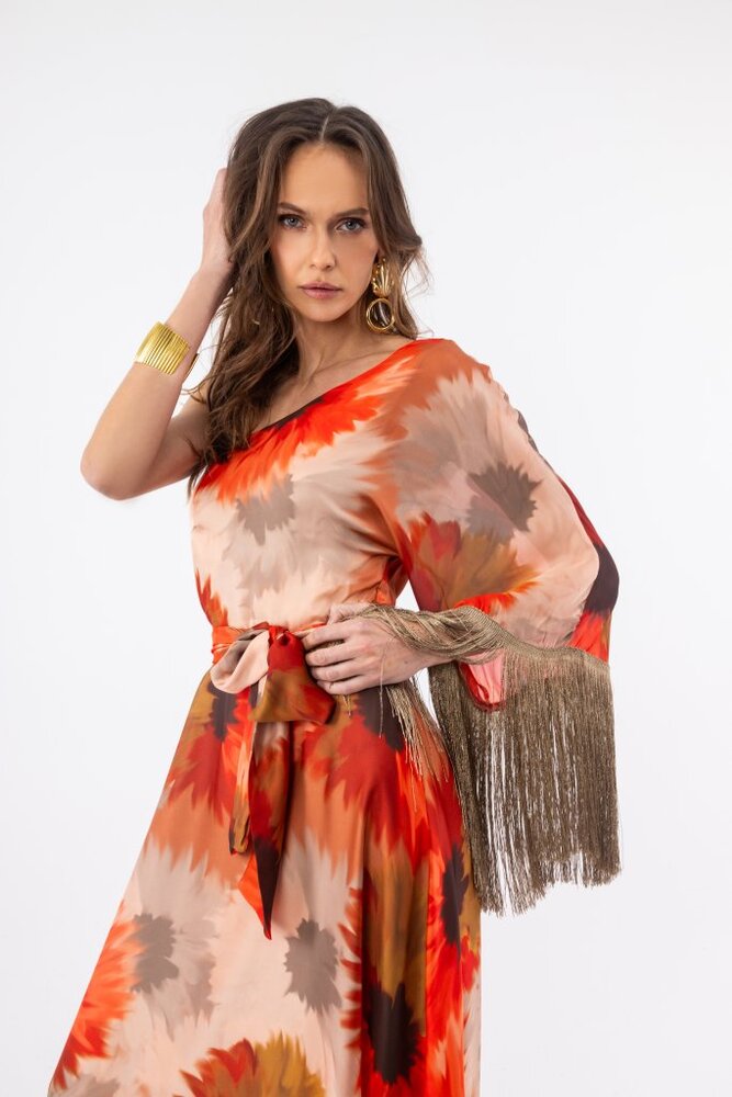 OPEN FASHION WOMEN’S ONE-SHOULDER MAXI DRESS RED PRINTED WITH BELT & FLOWY FIT KM625.R