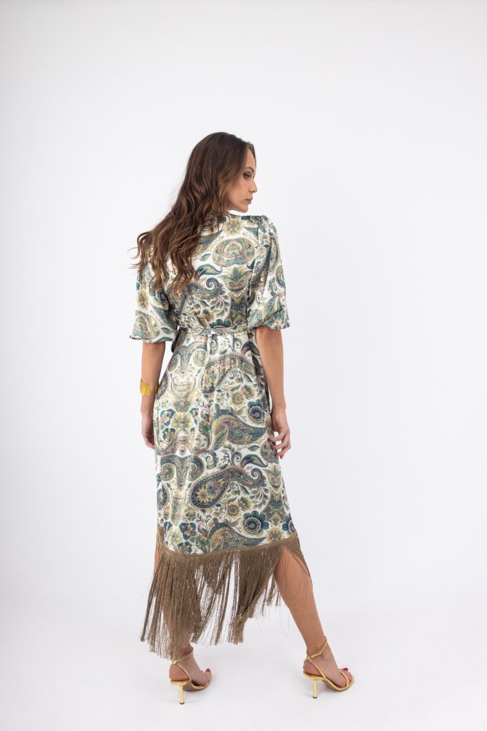 OPEN FASHION WOMEN’S OLIVE PAISLEY PRINT MAXI WRAP DRESS WITH FRINGES & BOHEMIAN PATTERN KM620.