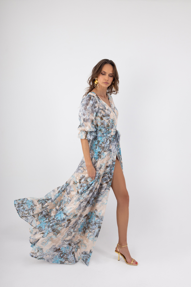 OPEN FASHION WOMEN’S ECRU WRAP MAXI DRESS WITH BLUE FLORAL PRINT KM612. B