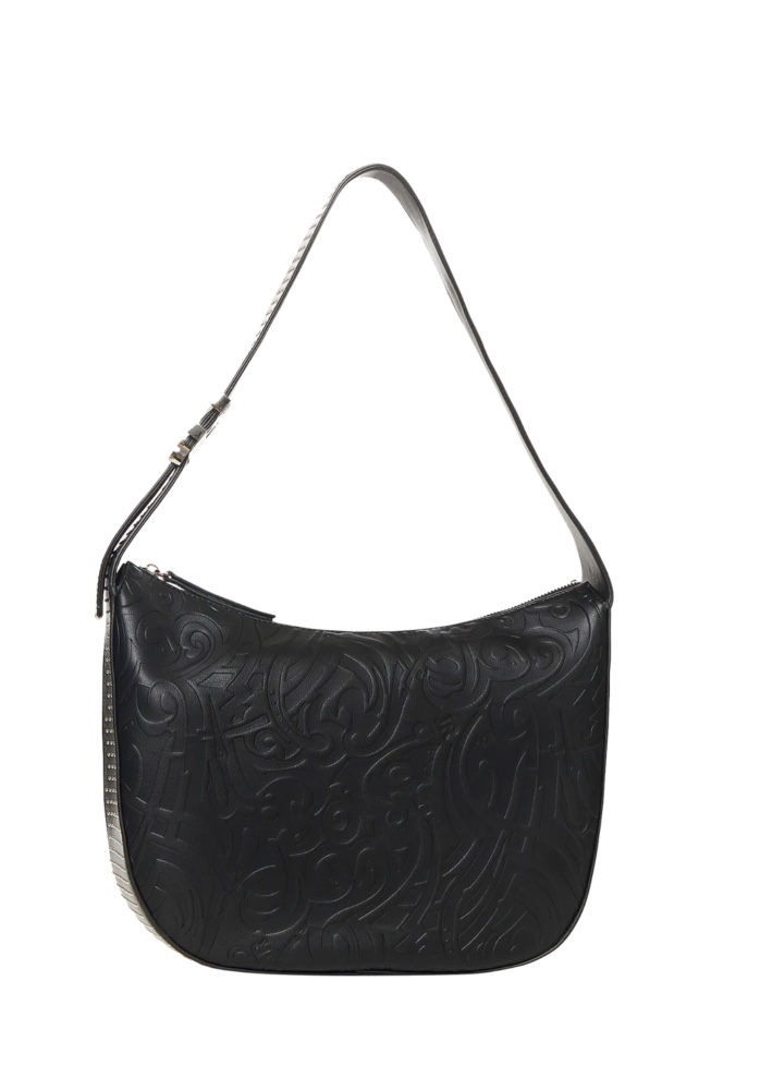 Shoulder bag with a refined design characterized by an engraved motif that enhances the elegance of the model. Designed to add a decisive and distinctive touch of style, it is ideal for completing modern outfits and character with a versatile accessory.