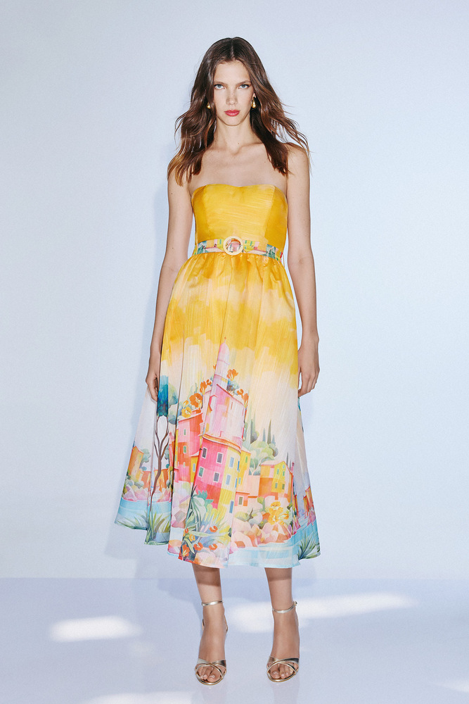 - Twins Fantasy στράπλες midi φόρεμα με εντυπωσιακό καλλιτεχνικό print σε φωτεινές καλοκαιρινές αποχρώσεις. Το εφαρμοστό μπούστο αναδεικνύει τη σιλουέτα, ενώ η αέρινη φούστα και η ζώνη στη μέση προσθέτουν κομψότητα και θηλυκότητα. Ιδανική επιλογή για καλοκαιρινές εμφανίσεις, εκδηλώσεις και ιδιαίτερες περιστάσεις.