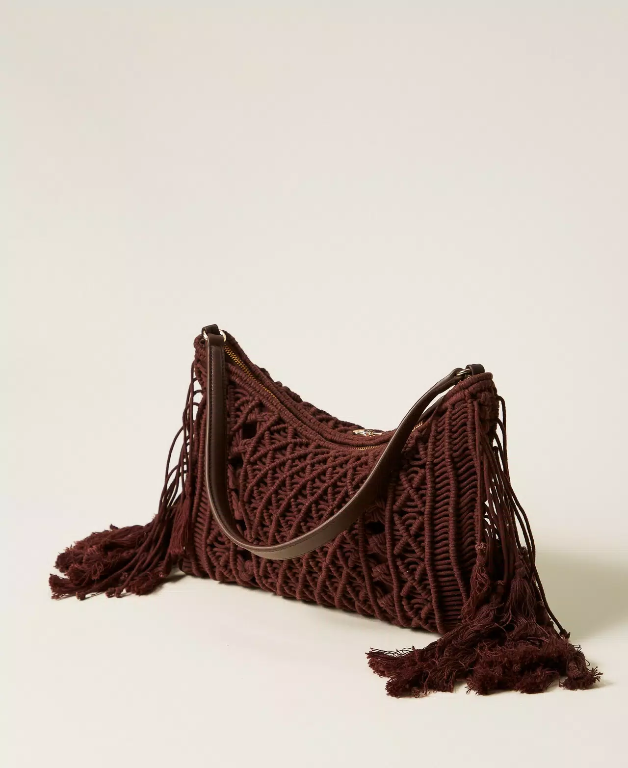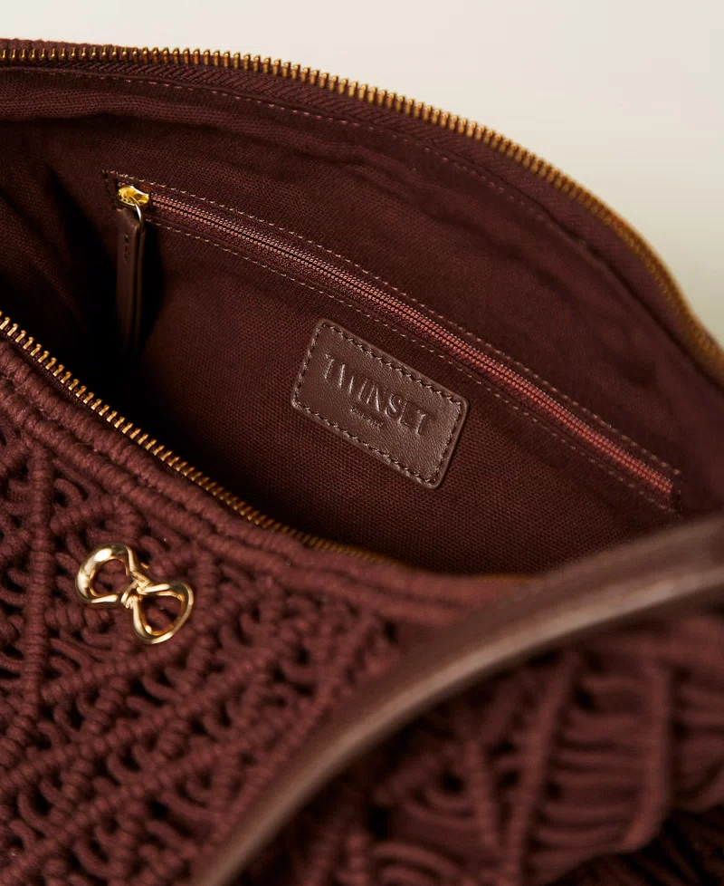 - Twinset τσάντα ώμου τύπου hobo από βαμβακερό σχοινί με βελονάκι, πλεγμένη και δεμένη εξ ολοκλήρου στο χέρι, με κρόσσια στα πλαϊνά. Κλείσιμο με φερμουάρ, δερμάτινο λουρί ώμου σε αντίστοιχο χρώμα, λογότυπο και εσωτερική φόδρα σε αντίστοιχο χρώμα.
