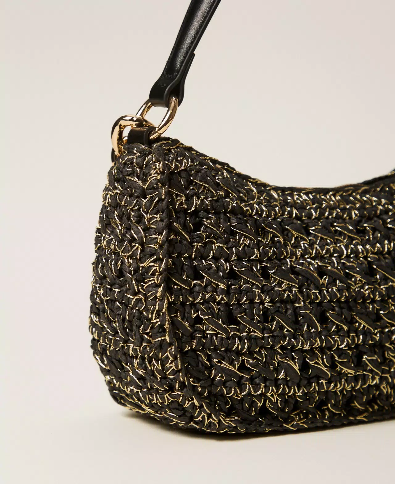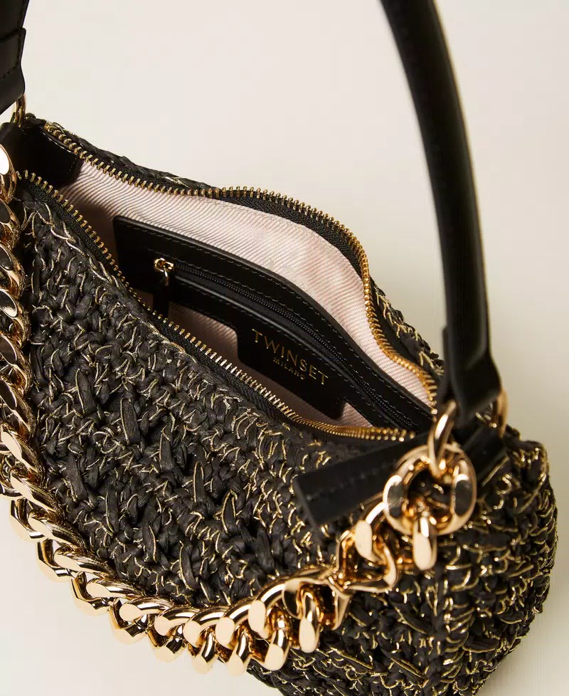 - Twinset μεσαία μαύρη τσάντα hobo Liliane από χειροποίητη πλεκτή ραφία κυτταρίνης, με μεταλλικό φερμουάρ και δερμάτινο φερμουάρ σε αντίστοιχο χρώμα. Διαθέτει δύο αποσπώμενες χειρολαβές – μια δερμάτινη επενδεδυμένη λουρίδα και μια αλυσίδα από ελαφρύ κράμα επιχρυσωμένη – που μπορούν να φορεθούν μαζί ή ξεχωριστά, ανάλογα με το στυλ.