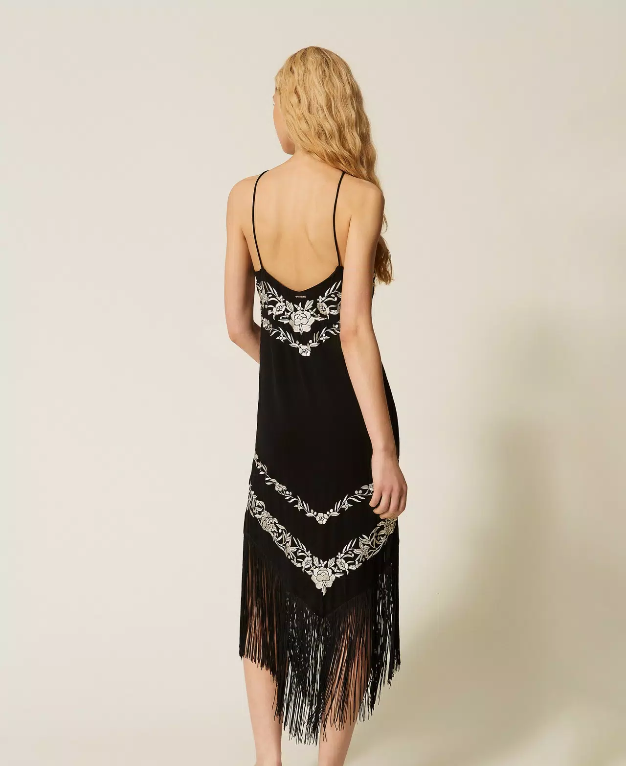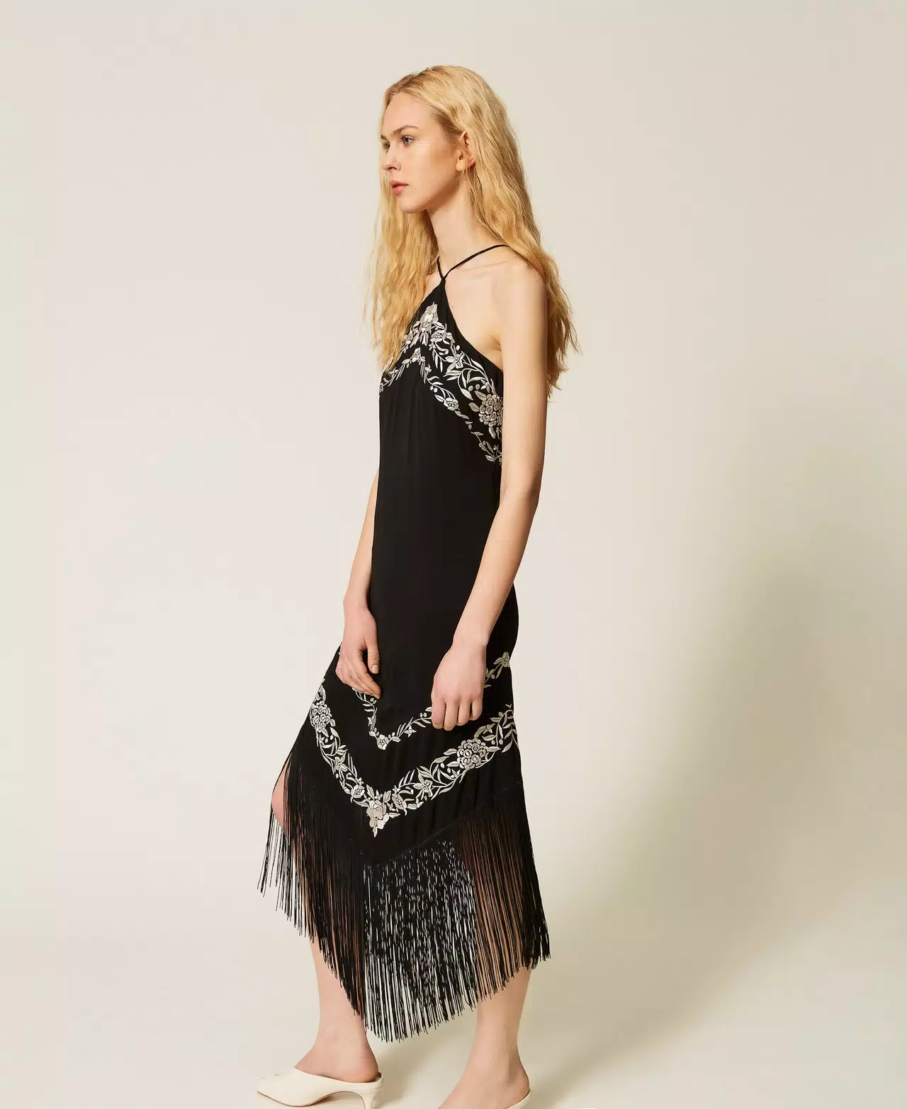 - Twinset γυναικείο φόρεμα μαύρο με κεντήματα και κρόσσια