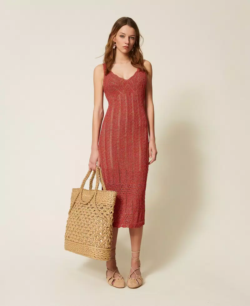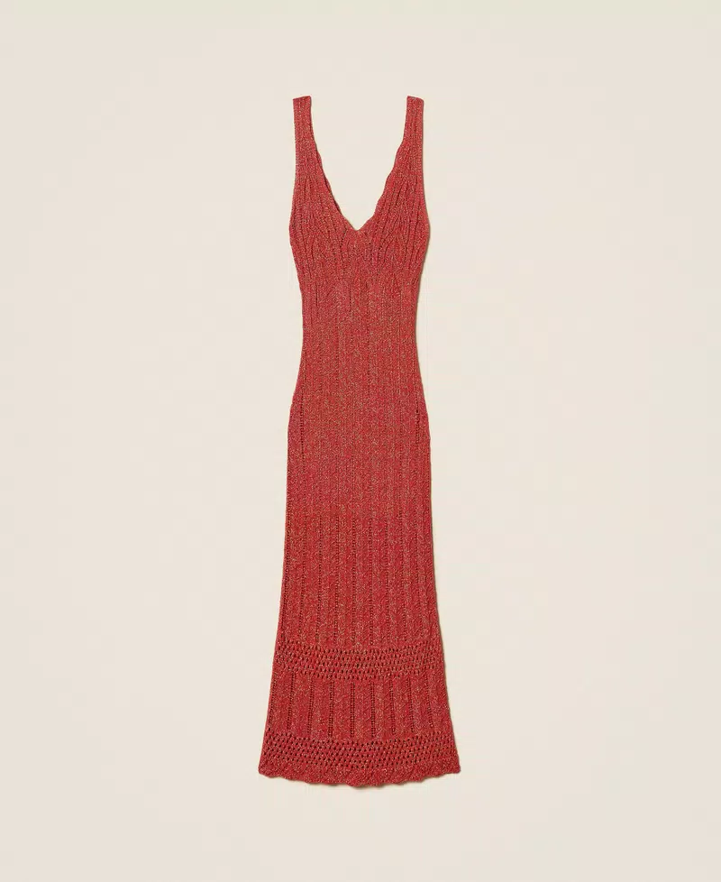 - Twinset μακρύ φόρεμα από βισκόζη με λούρεξ, κατασκευασμένο στην Ιταλία, με διάτρητο μοτίβο chevron. Βαθύ ντεκολτέ σε σχήμα V, τελειώματα με κυματιστό σχέδιο, φόδρα, εφαρμοστή γραμμή.