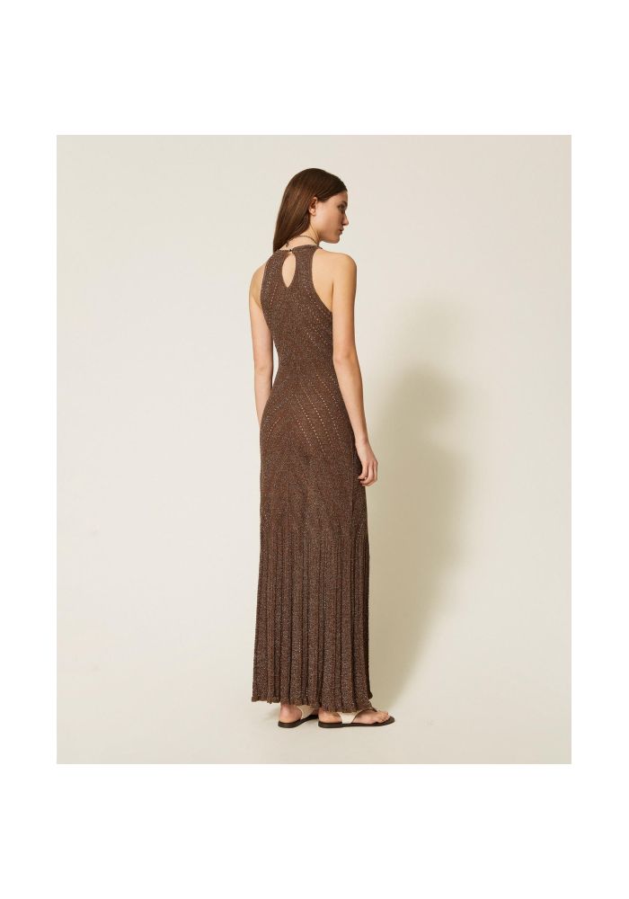 - TWINSET Μακρύ πλεκτό καφέ φόρεμα από λινό με lurex