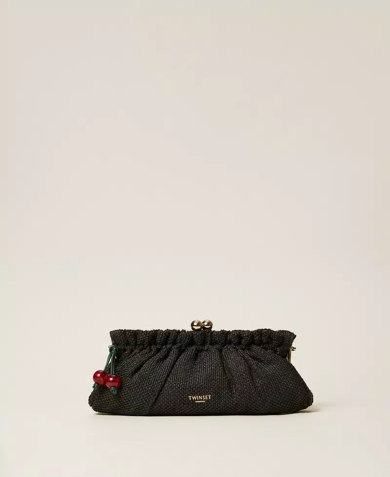 - Twinset φάκελος από υφαντό ύφασμα ραφίας με πολύχρωμα γούρια κερασάκια από ρητίνη, με φόδρα. Κλείσιμο με μεταλλικό κούμπωμα τύπου σούστα, σούρωμα στο επάνω μέρος, μεταλλικό λογότυπο με γράμματα στο μπροστινό μέρος.