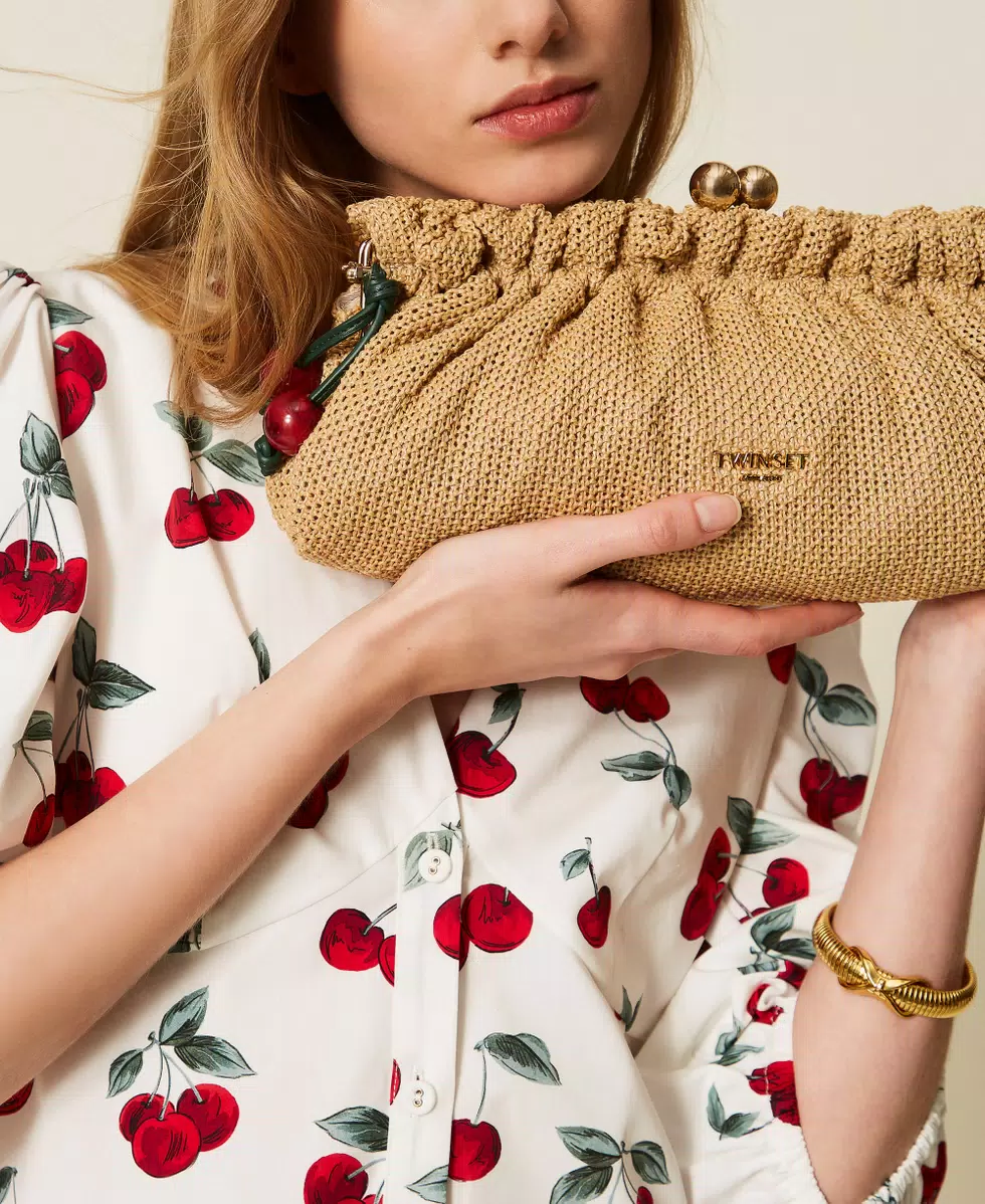 - Twinset φάκελος από υφαντό ύφασμα ραφίας με πολύχρωμα γούρια κερασάκια από ρητίνη, με φόδρα. Κλείσιμο με μεταλλικό κούμπωμα τύπου σούστα, σούρωμα στο επάνω μέρος, μεταλλικό λογότυπο με γράμματα στο μπροστινό μέρος.