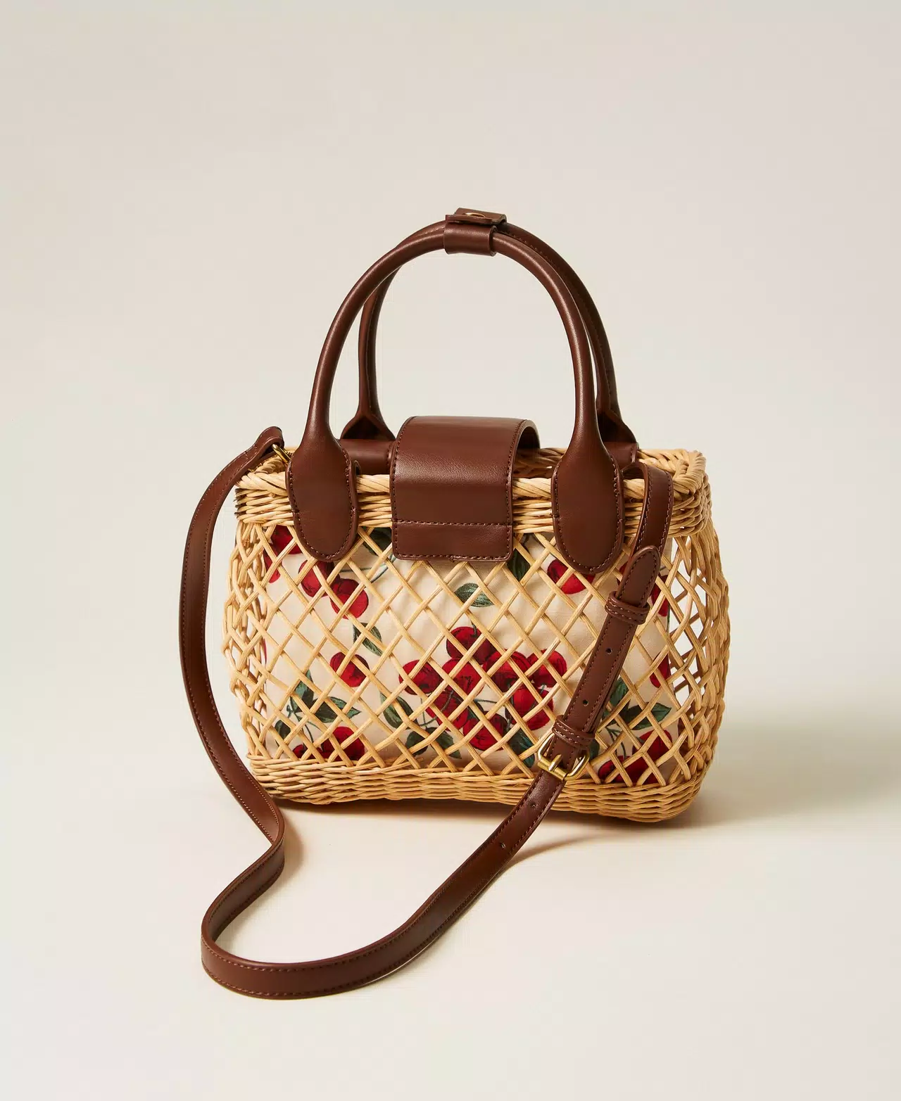 - Twinset τσάντα ώμου τύπου καλάθι, κατασκευασμένη από φυσικής απόχρωσης, χειροπλεγμένη ψάθα. Στο εσωτερικό διαθέτει αποσπώμενο υφασμάτινο νεσεσέρ με τύπωμα από το μοτίβο της συλλογής. Διπλή χειρολαβή, ρυθμιζόμενο και αποσπώμενο λουρί ώμου από συνθετικό δέρμα για χιαστί χρήση, κλείσιμο με λουράκι διακοσμημένο με λογότυπο σε μπρονζέ τόνο.