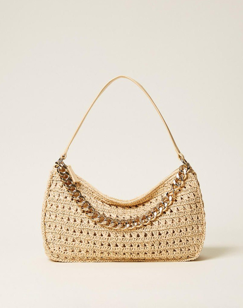 - TWINSET Γυναικεία τσάντα ώμου, με κροσέ ψάθινη όψη, κλείσιμο με φερμουάρ, σταθερό λουράκι ώμου και λεπτομέρεια αλυσίδα. Διαστάσεις: 39 x 23 x 10.5εκ. (Σύνθεση: 100% Χαρτί)