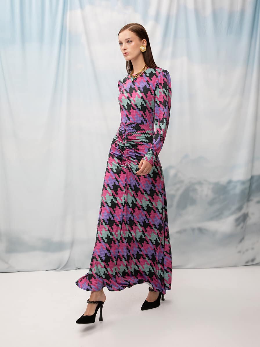 RUCHED JERSEY DRESS PIED-DE-POULE